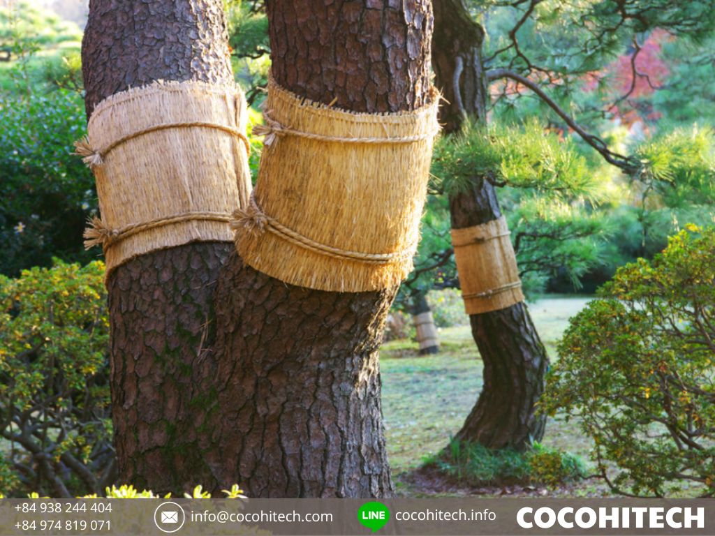 自然の美しさと木々の成長を大切にする皆さんへ。コモ巻きは、木々を健康に育て、美しい庭園や農地を作り上げるための必需品です。 秋の末に、松や杉の木の幹に菰を巻き付けること。冬を越すために下りてくる害虫を菰の中に止め、春先に外して焼く。