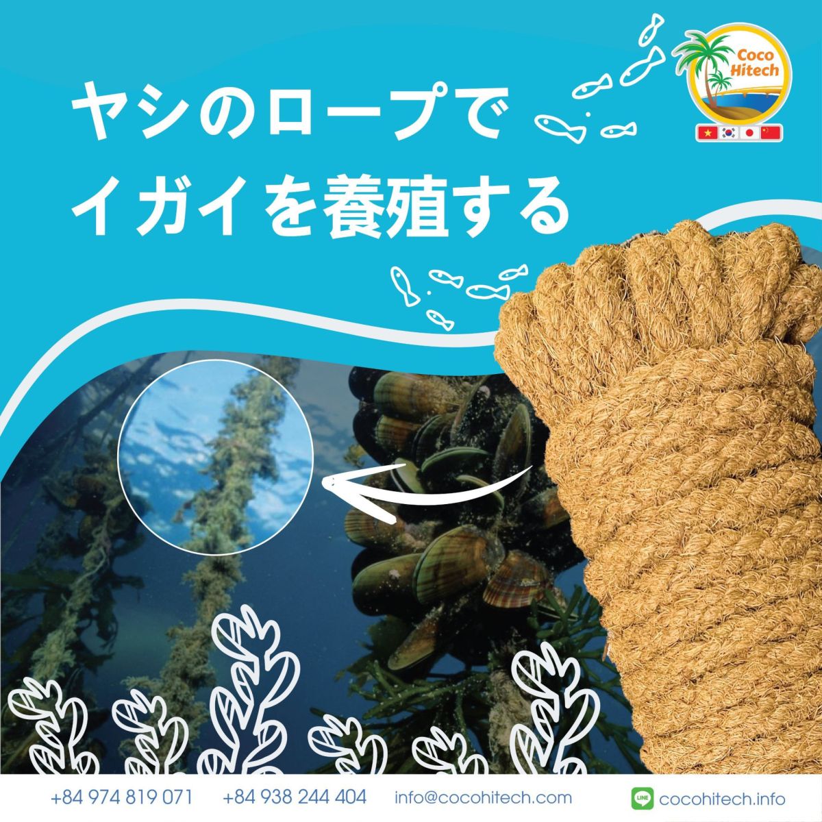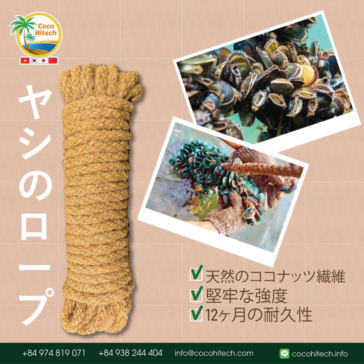 ココハイテックは、ベトナム高品質のヤシマット、ココナッツ繊維ロープを韓国に輸出する企業です。韓国市場に進出してどのようならなかったが、多くの韓国輸入が皆様の信頼を受け発注を着実に受けています。現在私達が主にコイアマットをたくさん売っていますが、今後のココナッツ繊維ロープの輸出量も増やすためにココナッツ繊維ロープの品質を絶えず開発してきました。ベトナムのヤシロープは、品質が良く価格も安いので韓国国内でのベトナムココナッツ繊維ロープを輸入してコイアマットする企業がグィサイズが非常に多いです。それだけでなく、最近では、特にミドリイガイの養殖用に、太さ16mmのココナッツファイバーロープの生産がヨーロッパに輸出されています。