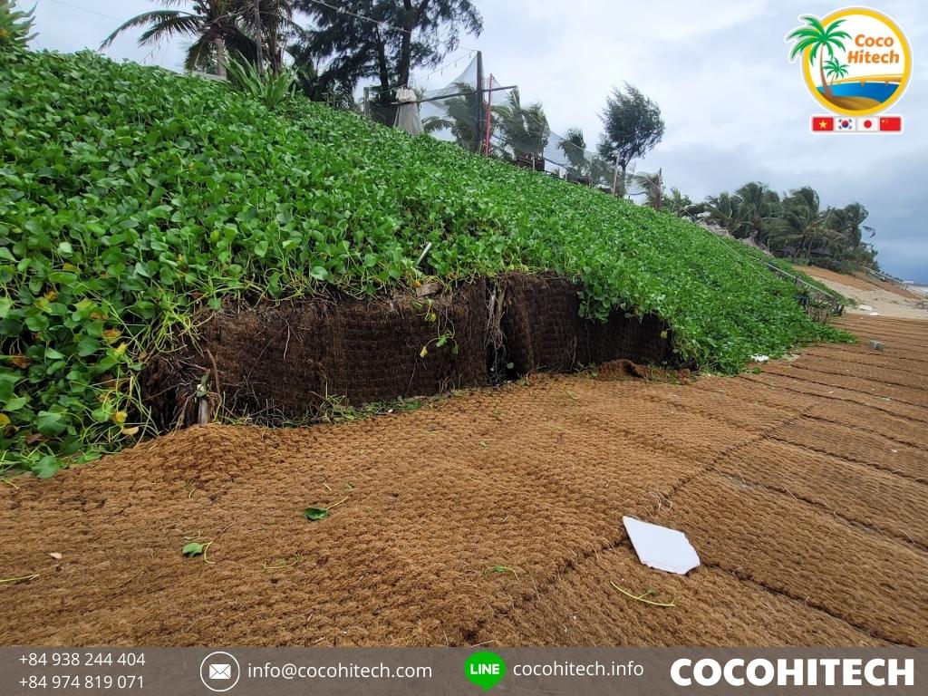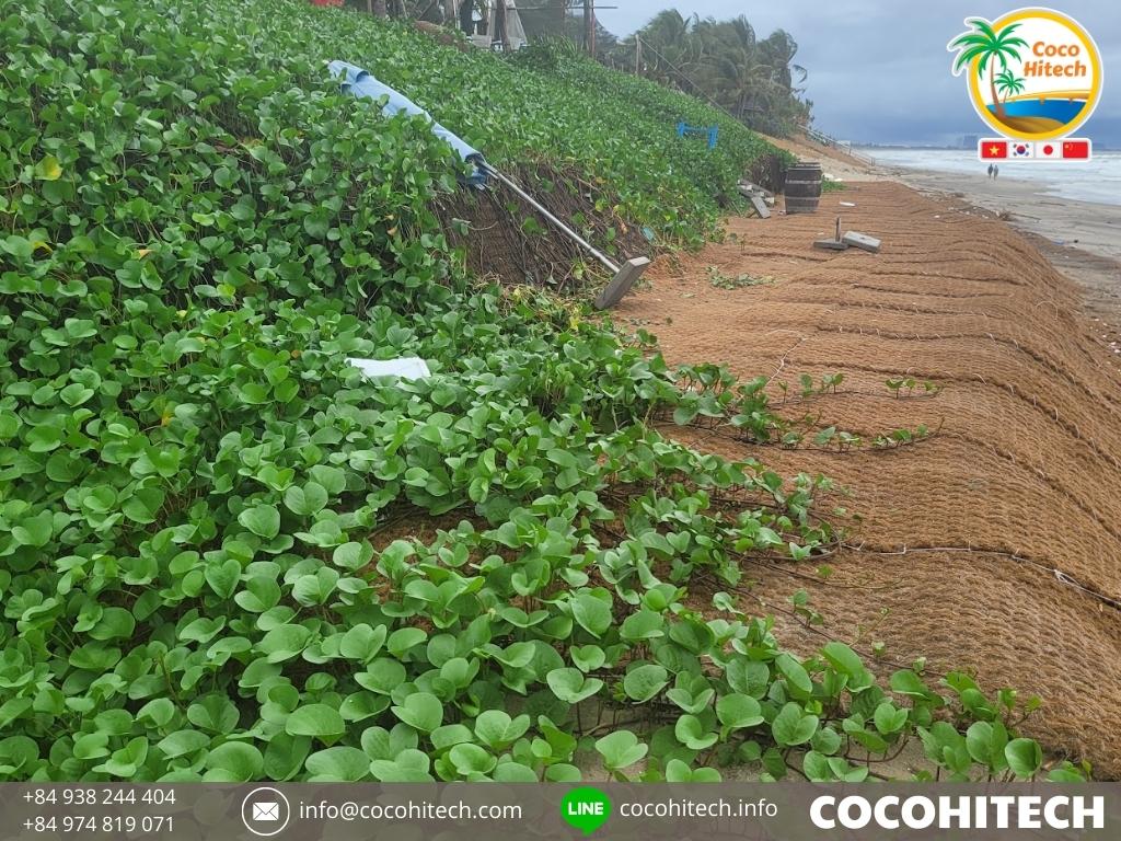 - 植生の確立:ヤシマットは、海岸堤防に沿って植生を確立するための理想的な基盤を提供します。地元の海岸植物や草を直接ヤシマットに植え付けることで、根の成長を促進し、土壌を安定させます。植生が根付くにつれて、堤防はさらに強化され、浸食に対する耐性が高まります。