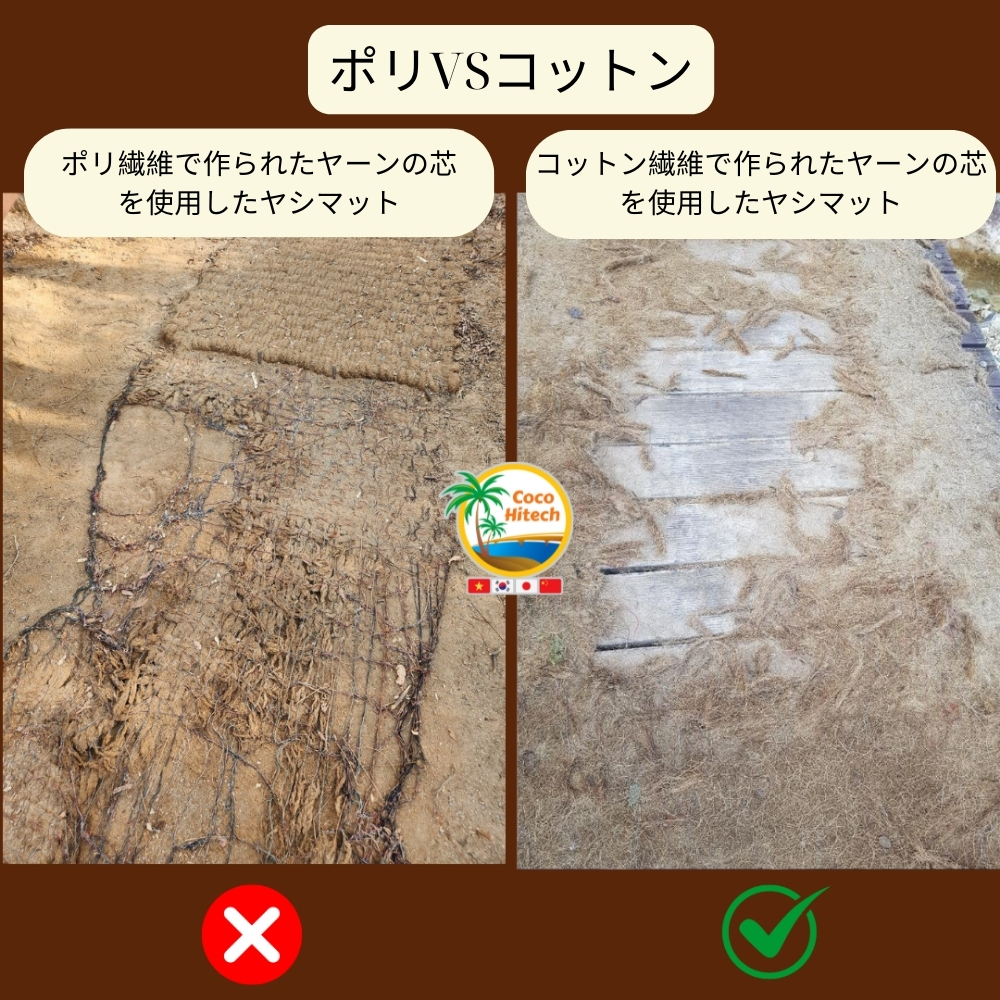 分解の難しさ:ポリエステルは自然に分解するのに比較的長い時間がかかる合成繊維です。ココナッツマットは一般的に生分解性のある材料で作られているとされていますが、ポリエステル糸は自然な分解に難しさを引き起こす可能性があります。