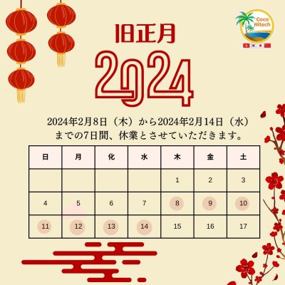 大切なお客様へ! Coco Hitechは、2024年2月8日から2024年2月14日まで、旧正月を祝ってお休みをいただきます! 🌟 このお祝いの期間中、私たちのチームはリフレッシュし、大切な人との時間を過ごすために、一時的に活動を休止させていただきます。 📅 休業日: 2024年2月8日から2024年2月14日まで。 2024年2月15日に通常営業を再開し、お客様のご要望にお応えいたします! ご理解とご支援に感謝いたします。皆様には、喜びと繁栄、幸運に満ちた素晴らしい旧正月をお祈り申し上げます! 🎊 敬具 Coco Hitechチーム